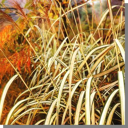 "Eulalia Grass"'Cabaret' Leaves with white centres and green margins. H 270 cm.-W120 cm. Large, bold, hardy, droughttolerant, easy to grow. greatly appreciated and loved by the prairie stylegarden disciples. They are perennials with a long flowering season, outstandingautumn colours and winter interest. They are unfussy abouttypes, free draining to heavy but not waterlogged.